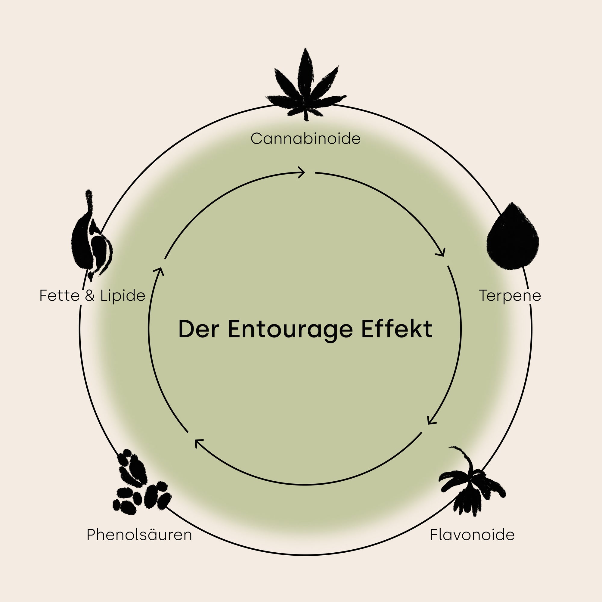Der Entourage-Effekt beschreibt die synergistische Zusammenarbeit der verschiedenen Verbindungen in der Hanfpflanze, einschließlich Cannabinoiden - wie CBD und THC - sowie Terpenen, Flavonoide, Phenolsäuren und Fetten.